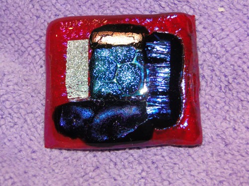 Still playing around with the dichro, learning what glass designs/combinations work well. Had some dismal failures last week, which is a more painful way to learn, but still – it’s learning … I want to do more with pendants and badge reels, so I plug along. Am thinking about getting a table top kiln for this – and probably will, but I’d have to clear a spot in the studio first – not as easy as it sounds.