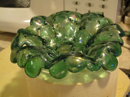 Also played with another marble trivet last week in reds and orange … it’s cracking, which tells me they’re different COE’s and thus can’t be mixed. I’ll keep playing with the marbles, but realize now I can’t have the creative fun I’d hoped to have. Slumped my first trivet into a bowl of sorts … it’s cute: