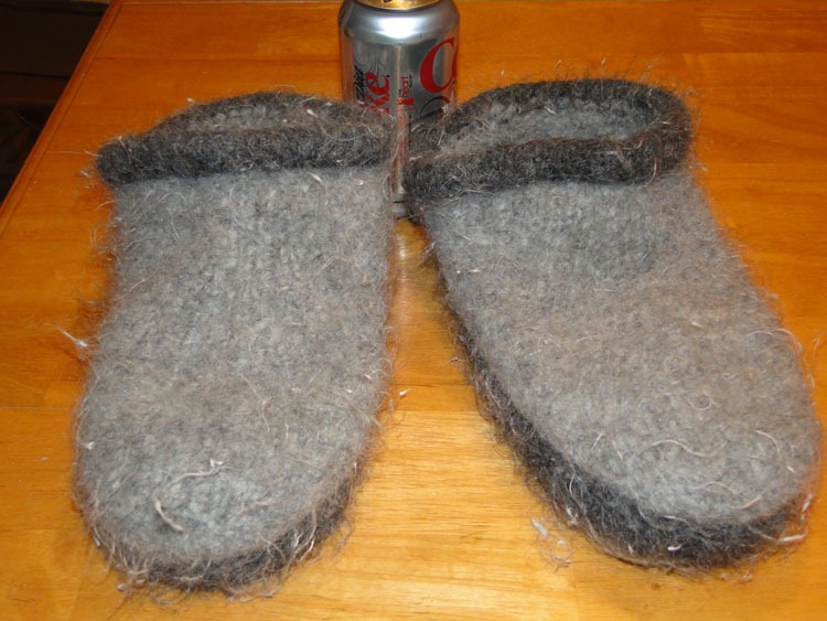 Grandpa will have no reason to yell at me this Christmas … here are his slippers: Done knitting – looking like they’re made for a giant at this point; Fresh from the washing machine, felted … still need a ‘haircut’; One done – one to go; Ready to dry – with 3 days to spare! Ha!! ![]()