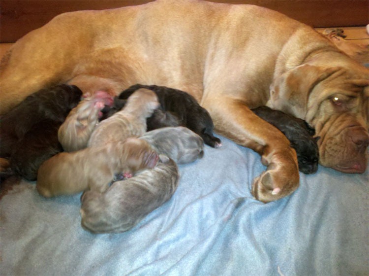 Whew … Sienna’s pups have made their grand entrance – fashionably late … At 2am Sienna finally entered the last stages of labor – and she wasn’t happy about it. We paced the floors, went outside, came back in, paced some more – then repeated this routine… Just about the time I was starting to get worried – the first pup arrived. We now have 10 new members of the family … and Mom and pups are doing great! And – Sienna is eating (ALREADY!) … SWEET!!