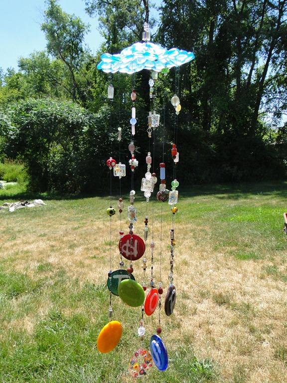 So true … But – it’s finally done! My glass mobile … After working through some production difficulties, and spending time learning the fine-art of beading wire (with my hand cramping up too many times to count!) … it’s hanging outside the studio, catching some summer rays … (disregard the dead grass – the gardener and I need to chat …) ![]()