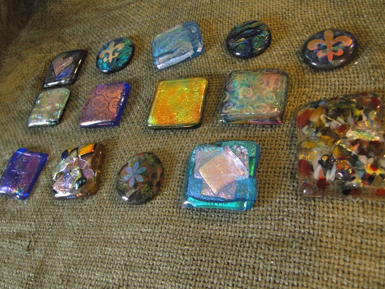 And I continue with the dichro cabs for my next batch of dichroic badge reels. My large dichro experiment – yeah, not so great. But here’s a picture. I think I’m done ‘playing’ with it, and I’ll just put clock parts on it and call it my studio clock …