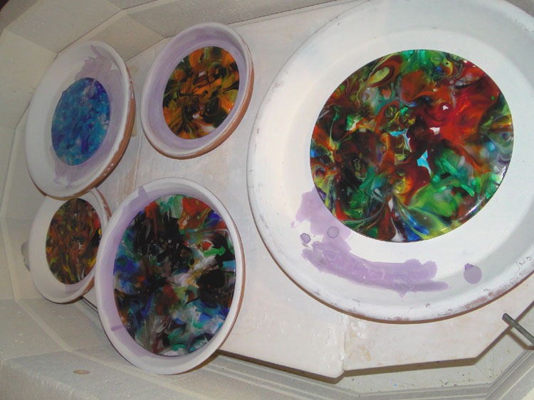 Getting closer to putting out some new bowls and badge reels … both kilns running as I type. Here’s the coffin loaded with a de-bubble run – future fall/Halloween bowls, a replacement ‘Caribbean’ and ‘Think Spring’ (vibrant, blooming-flower colors), and another large bowl (or maybe spoon rests …). And the production kiln – loaded with dichro cabs (and the new ornament experiment) …