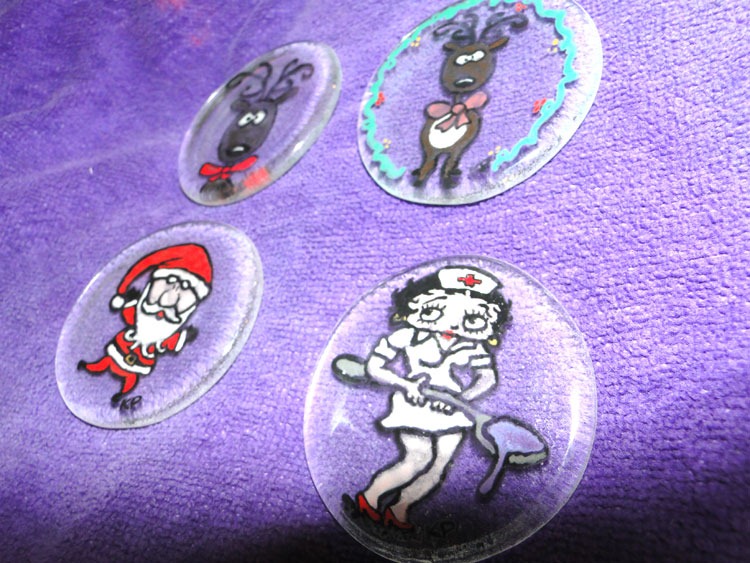 The Weekly Plan: Sending the kids back to school tomorrow … 5:30am sure is going to come early! But then I’ll have lots of studio time to wrap up the dichro cabs, do some more painting and finish up the bowls I’ve got going … My painted ornaments from last week: As I didn’t layer them, and I took them to a full fuse, they shrunk (silly me for not realizing before hand …). But – I still like them, and with this (shrinkage) reminder, I can work it in as a design element on future projects …