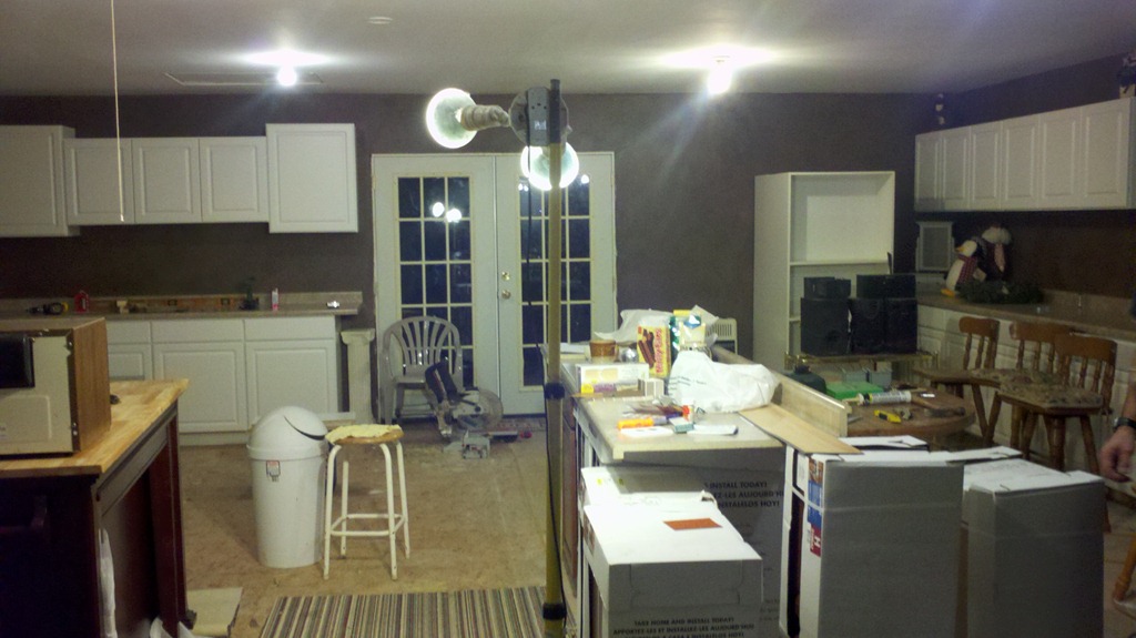 (The bulk of the cabinets are in, the new half-wall is (partially) up – DH is mudding the drywall, so I should be able to finish painting soon. The flooring is well acclimated, but we’re not ready to install it yet …)