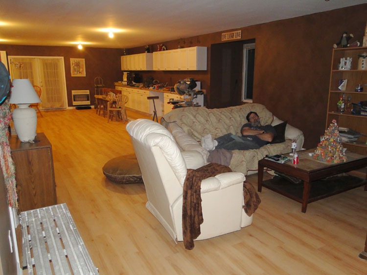 Here’s the studio with flooring and trim in place … That would be DH on the couch, who quickly lost consciousness as he looked over the ‘punch list’ … There’s still a lot of work to do – but I LOVE IT!!
