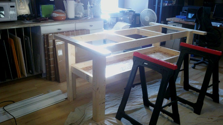 My work-table: 4’x8’ of carpeted surface will go on top of this base. DH decided (and I’m still not sure why) it should have oil-based enamel paint. He voted for black (over white) and I agreed. Of course, that was before I painted the base. I am now sporting black-stained hands that refuse to clean up with any amount of paint thinner (and my manicure is shot – AGAIN!!)!