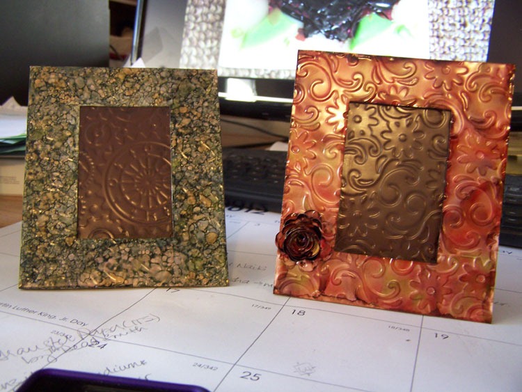Had some productive time in the studio … I have pictures. Working out some design element issues with fused glass ideas. Hope to figure this one out, as it could look stunning if it matches what I have pictured in my head. DH completed another stained glass window. I’ve been embossing metal frames … and I made a larger ‘tree of life’. I don’t like it in this frame, so I’ve asked DH if he will use it as a focal in a window … we’ll see.