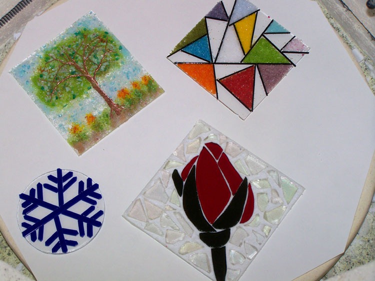 Here’s what’s cookin’ in the kiln as I type – night lights/sun-catchers and that ornament (finally fit and glued together … amazingly tedious work for such a small thing, and CROOKED to boot! Oh well – if it were perfect, it wouldn’t be mine) …
