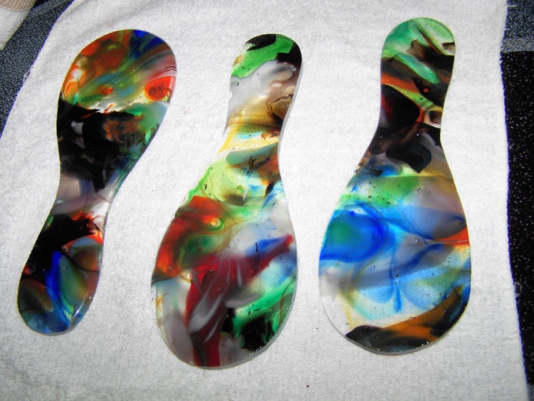 My stamping experiment (success!); Here’s DH working on his ‘Pool’ window – disregard the messy studio behind him, please …; Spoon rests cut and waiting for firing.