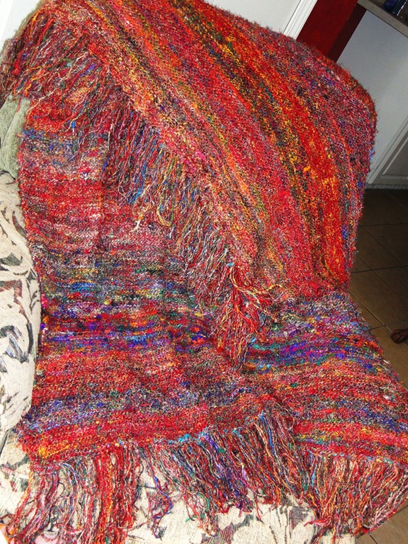 I wrapped up a knitting project: It’s a blanket (throw), 4’x6’ made of recycled silk (sari) yarn. I love it, it’s surprisingly heavy and will be perfect for snuggling on the couch! It’s my largest knitting project to date, and while it has some 25+ skeins – I kinda want to make another …