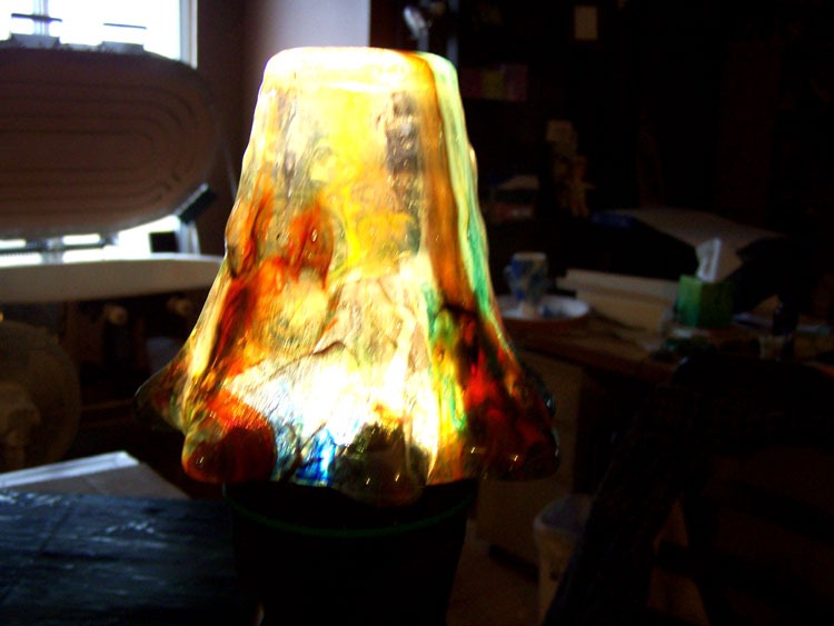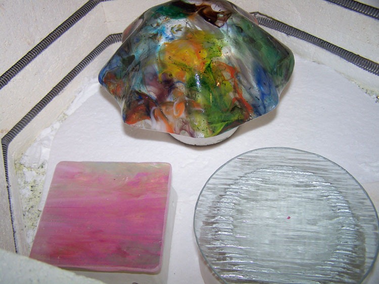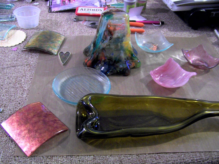 A pre-firing shot and a photo of some recent successes and projects. I’ve been playing with slumping some of DH’s stained glass. Having some fun making little bowls and catch-alls …