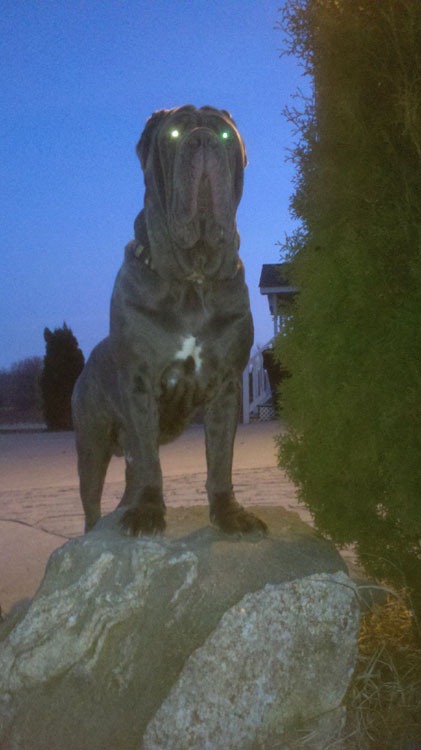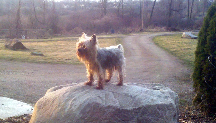 This unusually warm weather (Michigan teaser weather!) has us all playing in the yard. Here’s a picture of MIGHTY ZEUS … with his glowing majestic eyes (no thunder bolt, though). And not to be outdone (in his own little-man way), Chauncey playing ‘King of the Rock’ … and there ain’t nothin’ you can do about it!