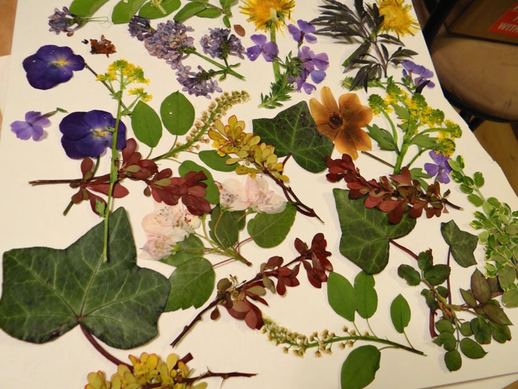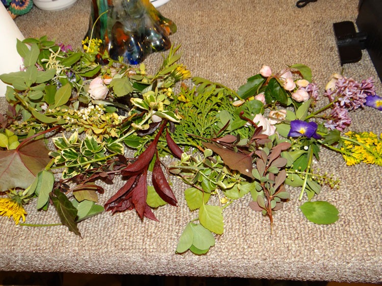 I walked around the yard, collecting bits of Spring flowers and interesting leaves: