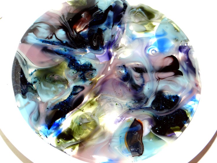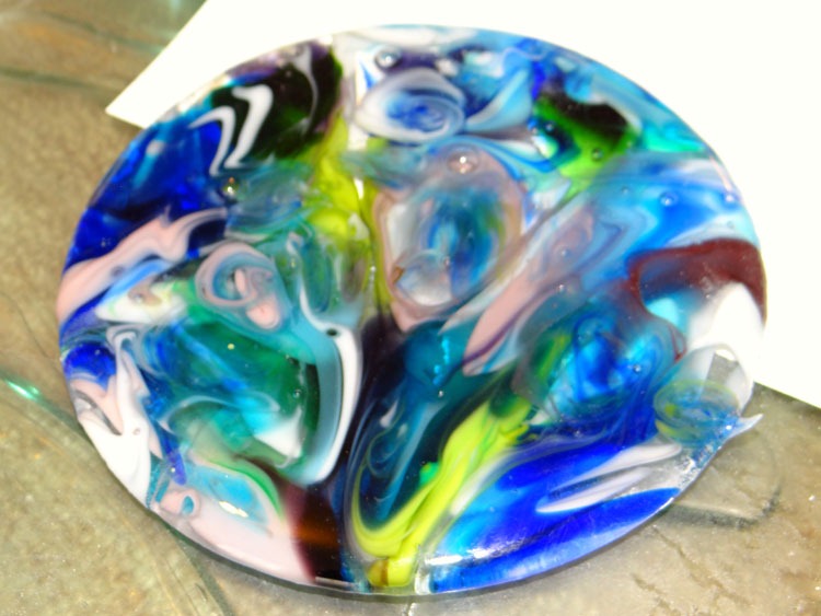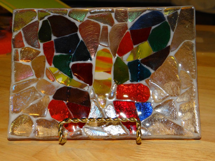 My mosaic butterfly is done. Now to decide what to do with it – frame it, make a mobile, hang it as a sun-catcher, or leave as is …? (Not the best photos, but the second one does show off some of the iridescent clear glass around the butterfly …)