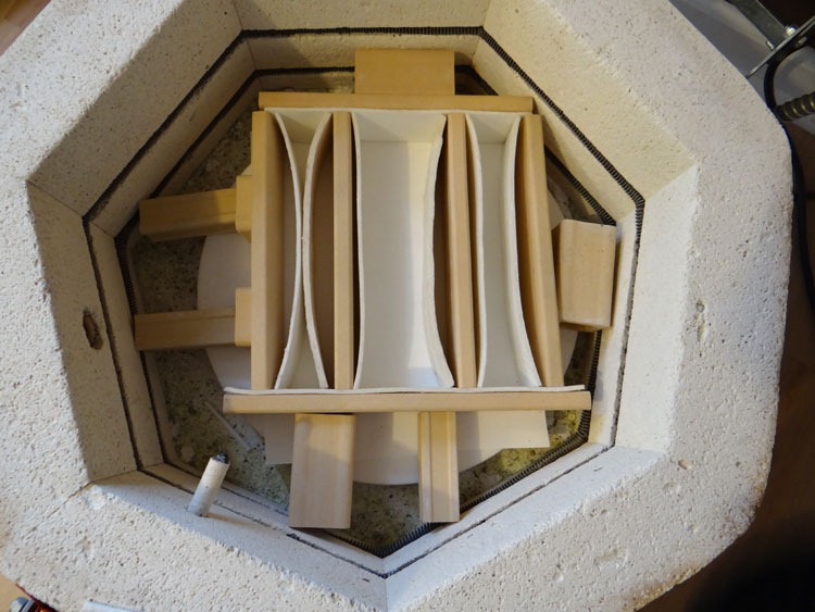 And, I currently have a pressed-bar/boiled glass experiment in the production kiln. Here’s the ‘before loading’ set up: