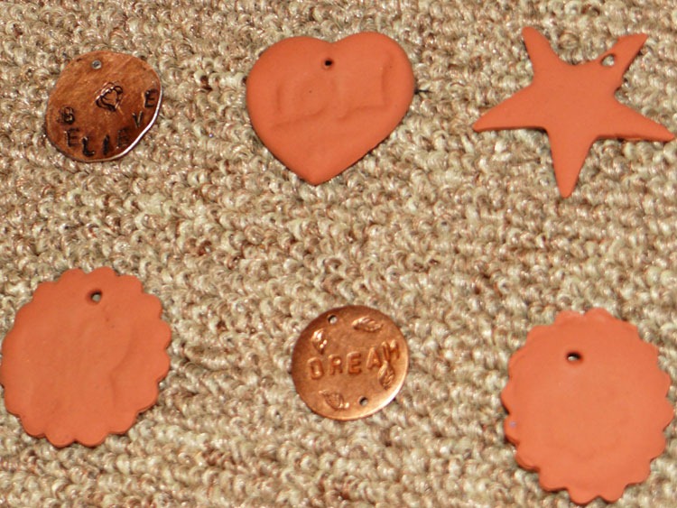 I smashed up/flattened a penny for some metal stamping and played with really cheap air-dry clay for tags ($0.75 at WalMart, now I know why …):