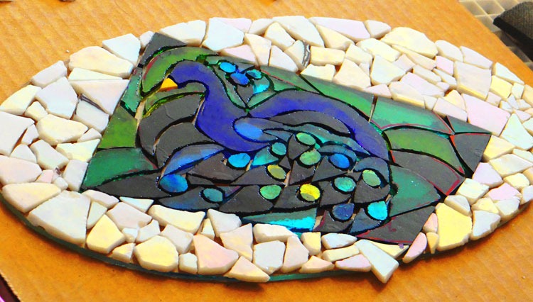 My Peacock Platter is coming along. The border is roughed in, almost ready for gluing and grouting: