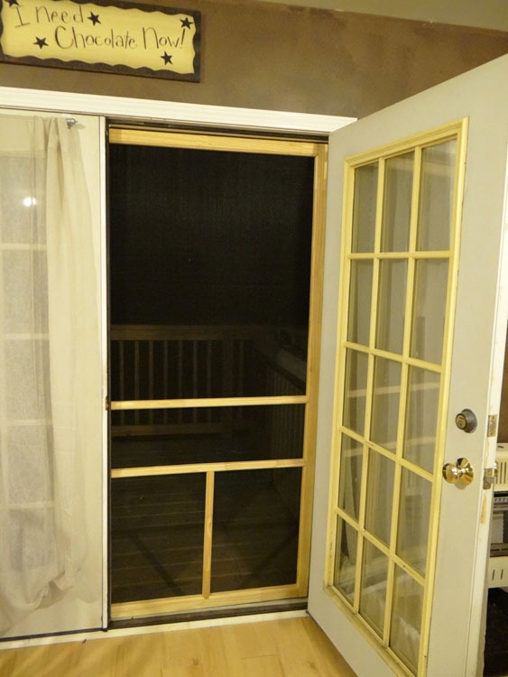 DH either loves me or was tired of my whining constructive complaints. I haven’t decided if they’re power-surges (umm, that’s code for hot flashes) or not, but in this in-between weather (not really AC weather yet), I’m not tolerating my studio without air flow – and I don’t do bugs … so he installed a screen door for me. BEAUTIFUL, isn’t it?!? (I’ll get around to painting it … someday!)