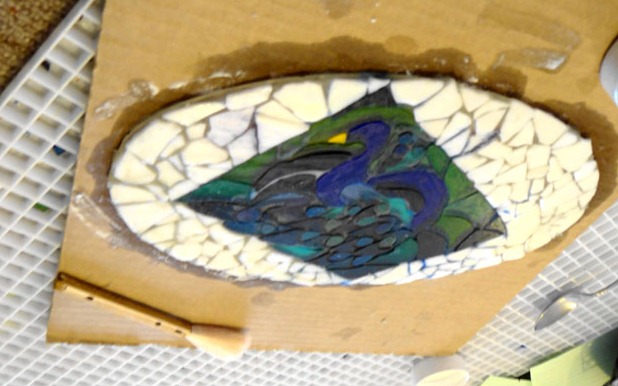 I’m making progress on my peacock platter. Having issue with the fusing adhesive I’m using (it’s called ‘No Days’) … it’s taking forever to dry (like almost a week!)!! I don’t know if it’s Michigan’s humidity or what? But, I finally have it grouted, and will be waiting for THAT to dry … and move on to clean up, fusing and slumping.
