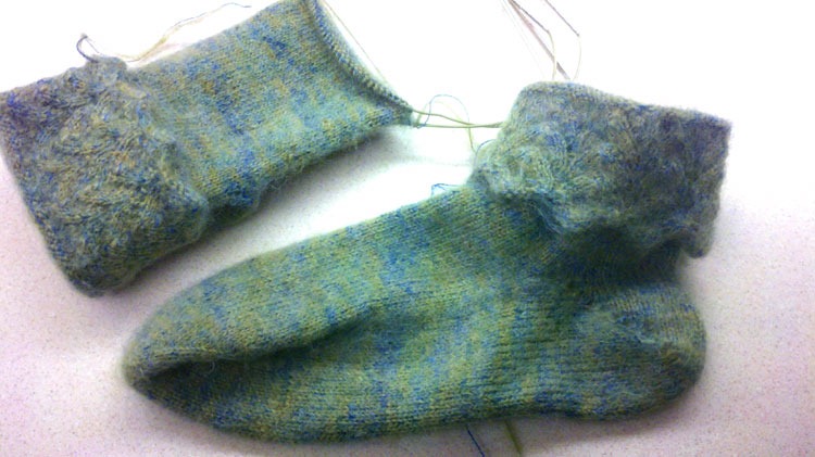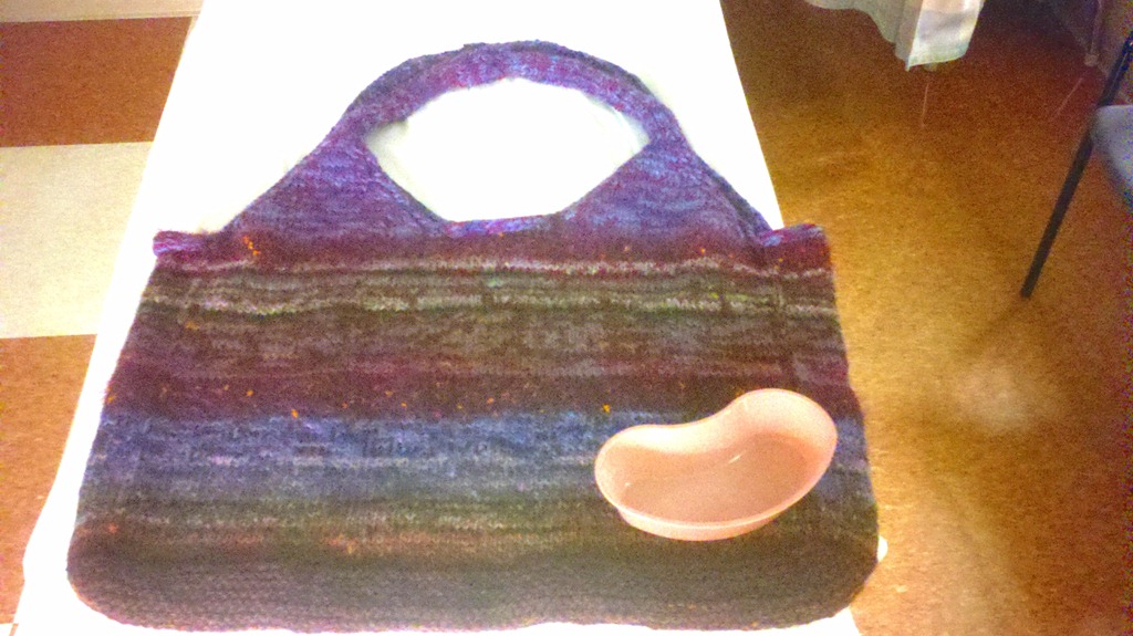 I also wrapped up a knitting project. It’s in the washing machine now, being felted. But here’s a photo taken with my phone (not a great camera). It’s ginormous! (That’s an emesis basin in the corner, ‘to give it scale’ … classy, huh?) And, a quick pic (again, lousy phone camera) of the socks I’m knitting now.