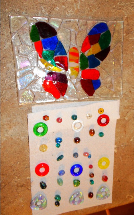 Now, armed with coffee, I’m in my studio planning for the week. I hope to get the coffin loaded with that blank-to-bowl slumping run. I need to ‘whip together’ a few more pieces to go with my peacock platter, as it won’t fit in my production kiln (BUMMER!), so I’ll need to load the coffin with pieces taken to just that (the right) temperature … I want to keep moving with some jewelry and dichro ideas. And, I think I’ll make a wind-chime out of my butterfly mosaic – something like this.