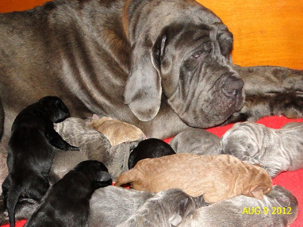 Both of my moms and their babies are doing great. We’re going through expected and acceptable post-whelping phases. It must be love on my part, as I CANNOT STAND the smell of liver – but my moms love it, so they’re getting it, along with puppy food (kibble), hot dogs, yogurt, eggs-n-cheese, peanut butter and canned (dog) food. You name it, if they like it – they get it. And Zonie smiles at me when she sees me heading from the kitchen – all scrunched-up/wrinkled-mass/Neo-style. It’s beautiful in a kinda-scary, homely, goofy sort of way … just like HER momma (Olivia – NOT me … Jeez!)