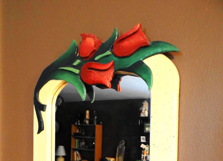 And lastly … DH had an idea about a glass photo-frame. Here’s the inspiration for it – a mirror we made (out of wood) some 12-13 years ago, when we were doing craft shows. Since it’s DH – and he only works when inspiration strikes, time allows and the stars are in alignment … it’ll be a while before he gets around to a finished piece ready for the kiln.
