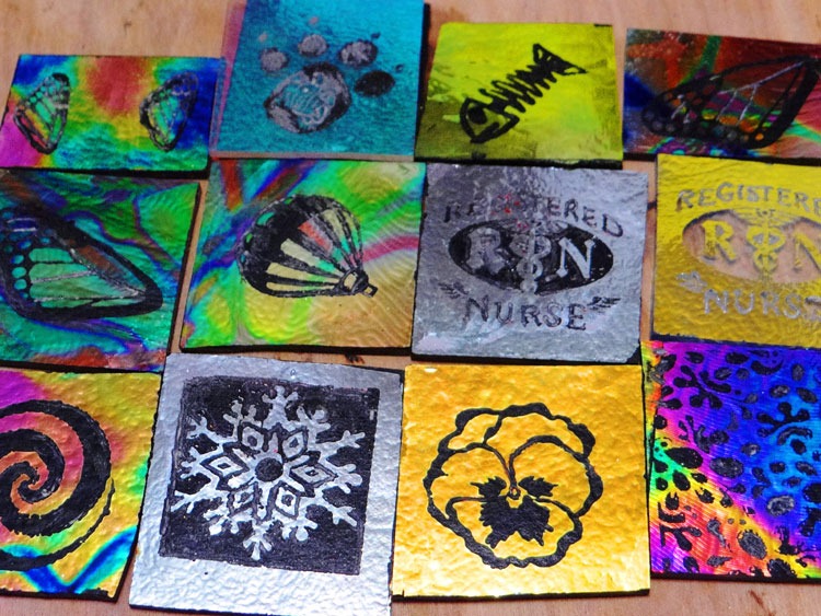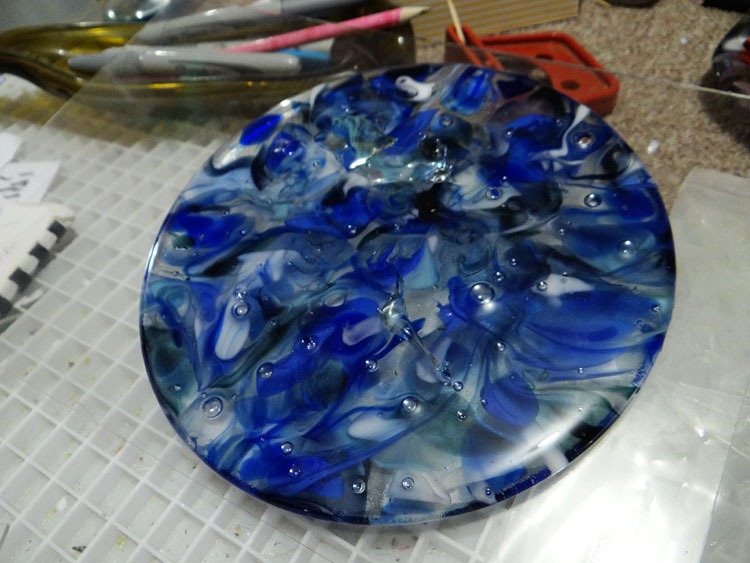 than to play in my studio when I’m annoyed and tired. But no … I’m waiting to see if the sun will come out (for a quick dip in the pool) before crashing – after a long, busy night at work – in order to go back for 12 more hours of fun tonight. So – I’m playing with my current studio projects: [I’m back to] painting on glass …