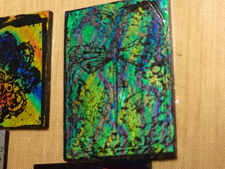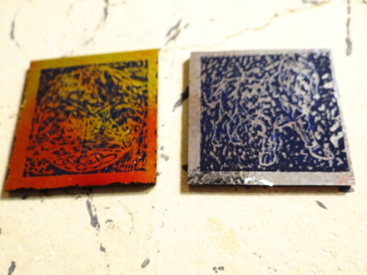 And, I’m working my way through another etching technique (from Glass Patterns Quarterly, Spring 2013) … but I’m having an issue. Dichroic glass isn’t flat, it’s a little lumpy. So my transfer mask didn’t cover fully. I’ve got some ideas to try (I have a heat press WITH felt blanket, HA HA!) … but, here’s what I have right now:
