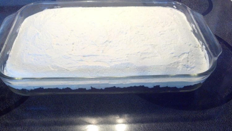 - To ‘properly’ frost a 9×13 cake*: Using previously chilled metal bowl and beaters (freezer), mix 3 cups heavy whipping cream and 3/4 cup powdered sugar for about 5-7 minutes on medium/high – until the MAGIC happens … and it goes from (frothy) liquid to (stiff peak) FROSTING … That’s it! You now have Frosting Crack!!! Put it on whatever you want!