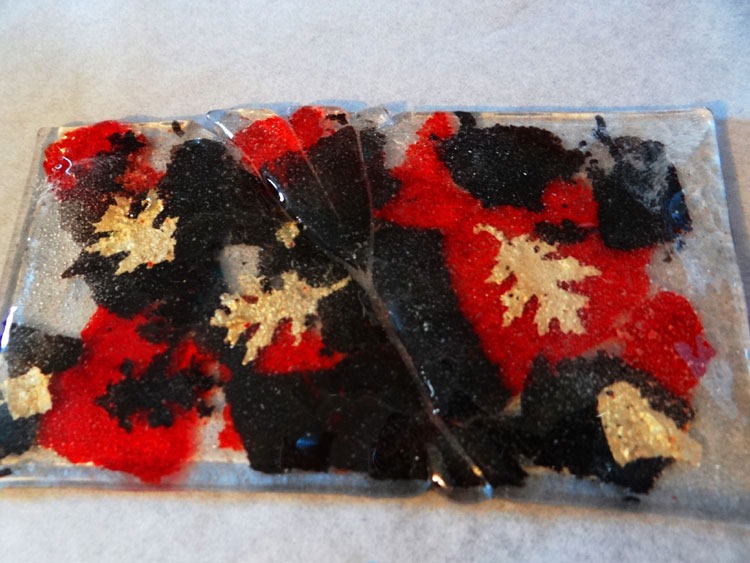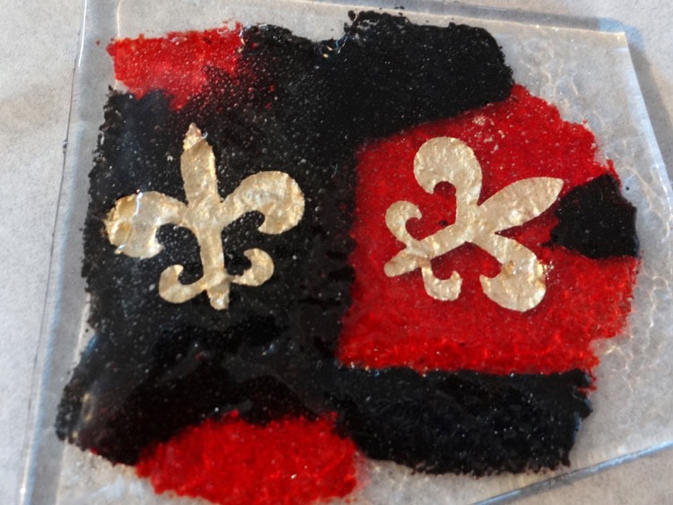 Here are my examples/learning to date: My first flexi-glass fuse (I decided to drop it on the way out of the kiln [?!?], so it has that nice [broken glass] ‘branch-design’ in the middle); second flexi-glass trial – I love me some fleur-de-lys; and an image of P.McGrain’s technique that I’m itching to try … AMAZING!