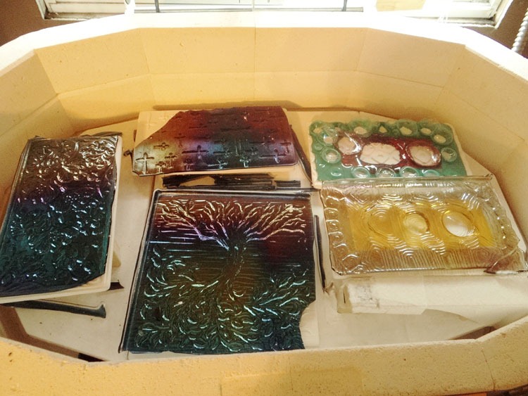 Lesson learned the hard way! DOH!!! I have five failed platters in my kiln … So much went wrong – splintering, bubbling, over-firing. Shoot, what a mess! I feel like a newbie. I thought my kiln and I had a better understanding of each other. So, I’ll try again – this time without the conservative, energy-saving full-kiln approach, as I just blew a couple hundred bucks in glass. DOH! I’ve closed the lid on the kiln, and I don’t even want to look at it! [Hanging head …]