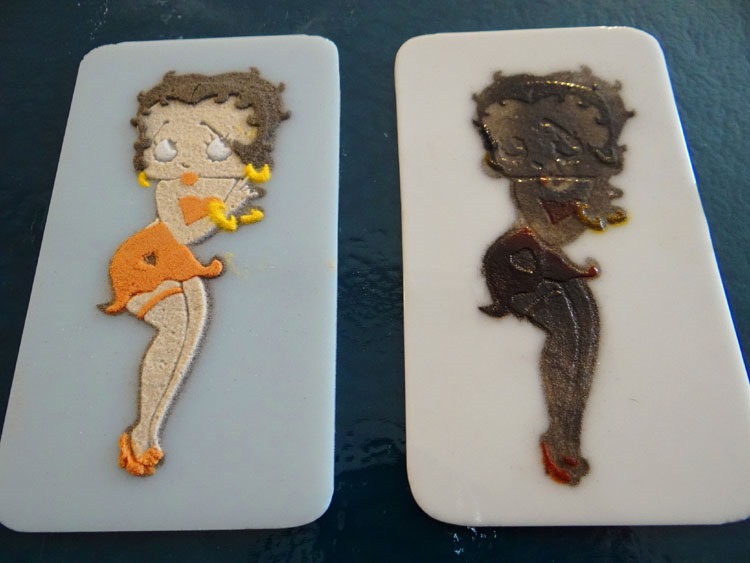 I also played a bit more with svg files, the plotter and screen printing: Betty Boop. Something happened here (right)… ??? Hmmm, I didn’t take it too hot; I also didn’t vent it (DOH!) – so maybe that’s why the red is yucky; I didn’t realize when I purchased them, but the screens are used – so maybe a chemical reaction from something on the screens??? And lastly – although it doesn’t hold true for her eyes (white opal) or jewelry (marigold opal), it’s possible that the black is overpowering the other powders as they’re a mix of transparents/opals … IDK. I’ve got the left piece firing in a vented kiln now, so we’ll see.
