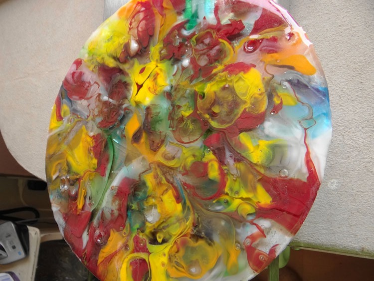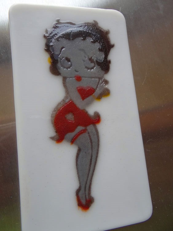 Just about running out of ideas to try for Miss Betty Boop. I thought I had it figured out – a chemical reaction within the powders, but … I don’t think so now. I think the charred/burnt look is actually the black base powder coming through, as the layers are so thin … Here’s my most recent trial. I put down the black base layer and covered it with clear – to prevent any powders from reacting. After firing, I added the colored layers (all opal powders). Overall, she looks deathly gray – until you hold her up to sunlight when you can see hints of the flesh tone coming through. I have one more trial in the kiln and one more idea for her before I (temporarily) give up and stew …