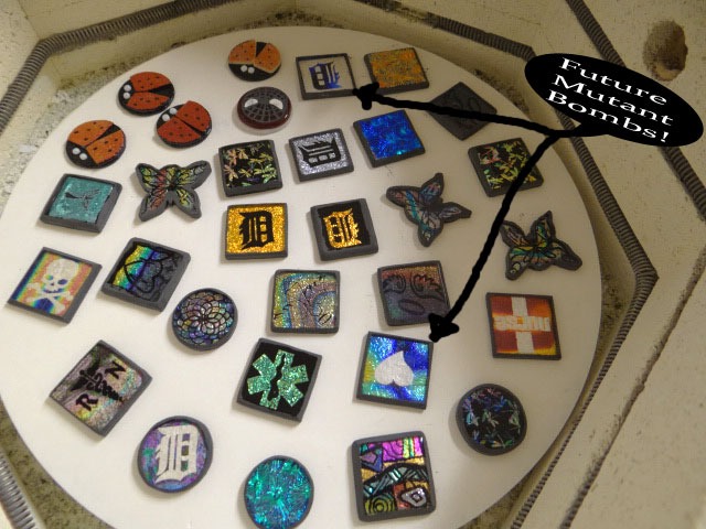 Hi Bridget! I’m not exactly sure what happened …You can see in the middle photo where the two ‘bombs’ were located – and just how far they jumped, fusing themselves to surrounding cabs. I do know that the mica doesn’t actually fuse, but lays between the two sealed layers of glass. I’d like to say bubbles or too much mica caused the problem, but I can’t … And – I had 3 other mica cabs survive (not explode) in the run. BTW – this cab run was just to set the enamel borders – so only about 1300 degrees … CRAZY, huh? 🙂