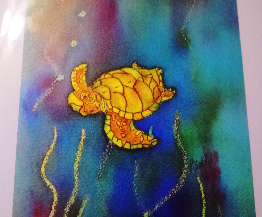 (This really means a lot to me – in an environment dominated by PAINTING artists and judged by an oil-paint-expert. But, more importantly – I had fun, and my ‘stuff’ was well received.) I also bought a couple of things … art note-cards. I love the colors and fun of this little watercolor turtle; and the “SARCASTIC ME” was totally drawn to this card … The inside message has gotta be something along the line of “Thinking of you …”
