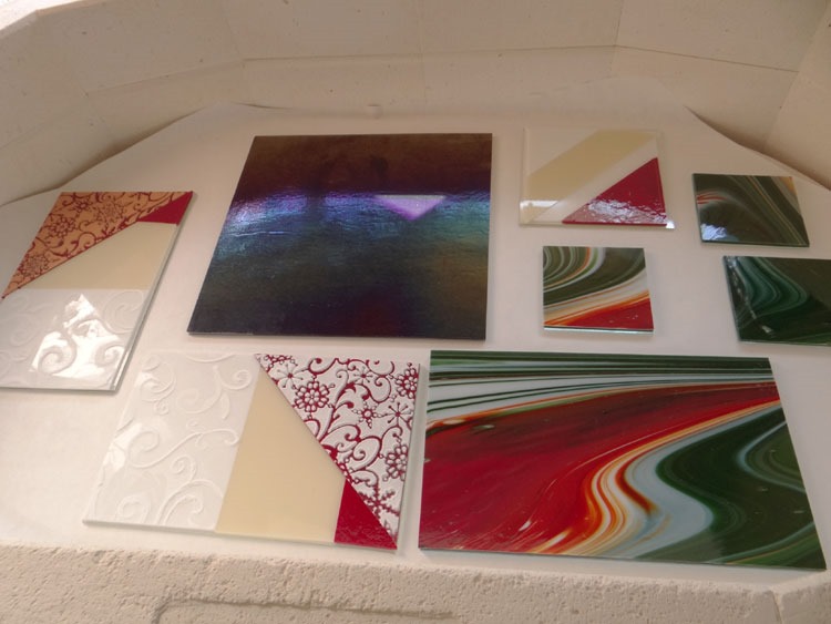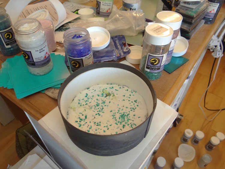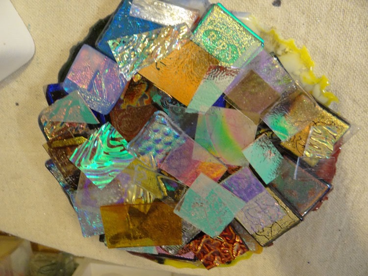 I have the coffin loaded with step one of some new functional Christmas items (bowls, platters, coasters) and another irid Tree of Life. (My last irid sheet, Oh NO! … It’s time for another trip to my favorite glass supplier!)
