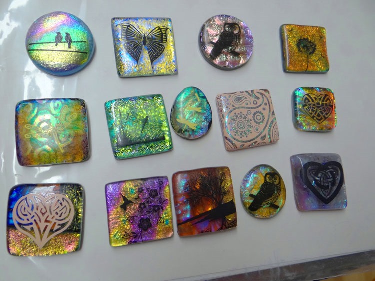 Dog-gone, but it’s hot in the studio tonight. I’m not complaining, really. All three kilns hitting 1300-1700 degrees will do that. In the meantime, while shedding excess water weight, I’m working on some cabs with decals, while my kiln programs are running. (Can’t wait to open them tomorrow and see how everything faired!)