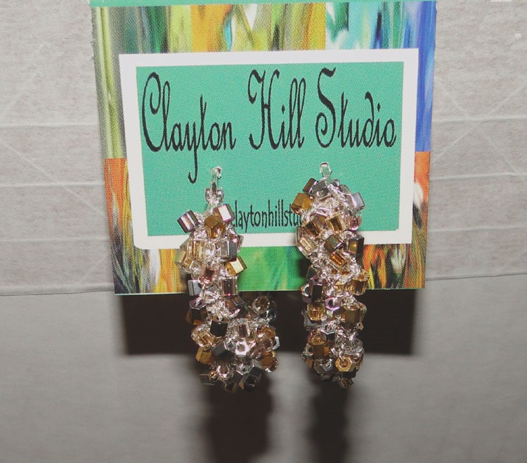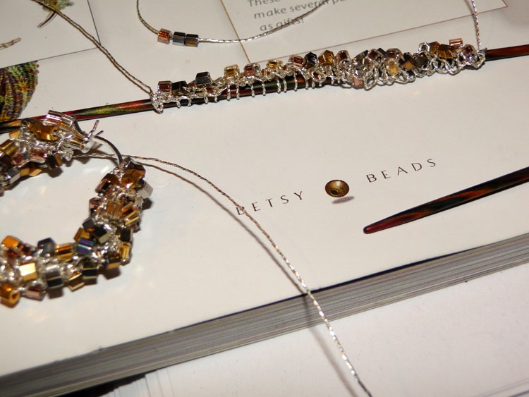 Back to busy hands: I’m knitting with beads and really fine thread. Those are size 0 needles (glorified tooth picks) and hex beads, knit onto earrings: