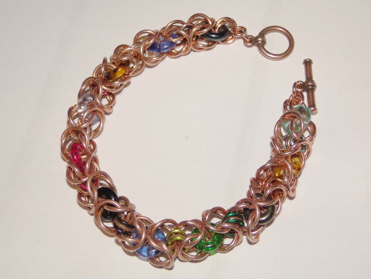 I also continue to play with chainmaille: A moebius sample piece and a copper byzantine/glass ring bracelet …