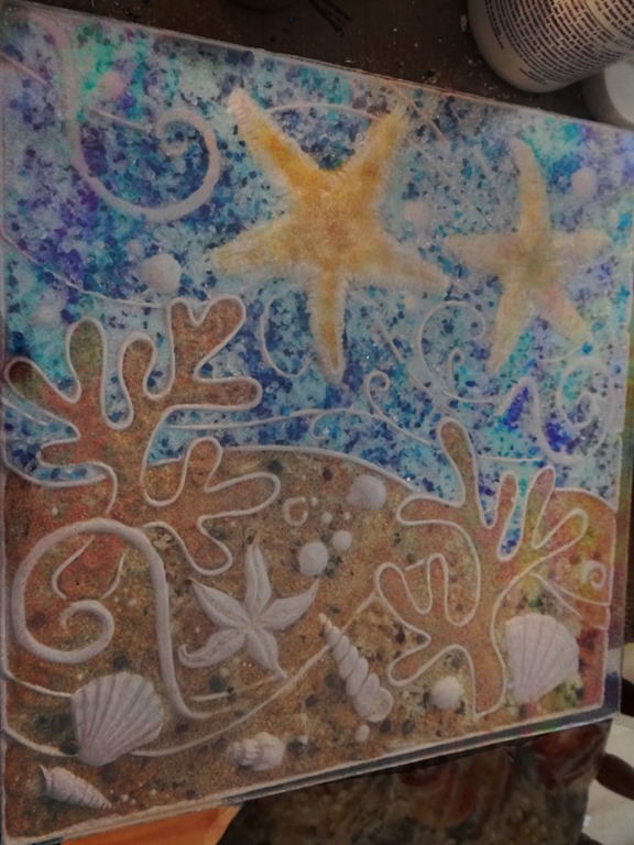 [OK – so I didn’t cry much today …] I did play a bit in the studio. I’m working on an ocean tile (with irid glass). Just about time to see what stage one of kiln firing does for it …