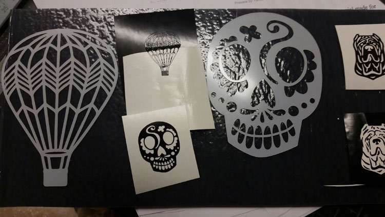 Still not too much going on in the studio. I’m waiting for some glass supplies to arrive (powders and frits and chemical reactions – Oh MY!) … So, I played with the Graphtec CE5000 [vinyl plotter] today. She and I are in-sync at the moment! I was able to take (new) 4 inch stencils and turn them into less than 1.25 inch vinyl decals! (I know, RIGHT?!?) That balloon needs more micro-weeding yet, but WOW! So far, so good! Since I still don’t have running water in the studio(!), I can take my time with ‘weeding’ (removing non-essential vinyl) …