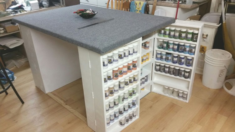 DH is helping me get back to glass … He built a new work station with MEGA frit storage. Awww – check it out! (Not quite done … but close enough for photos!). The other end has larger cubbies to store all of my enamels! SWEET!!! Thanks, Honey!