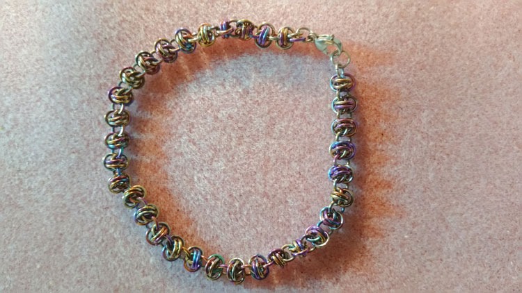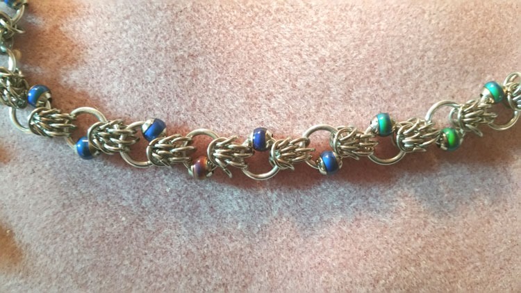 In between, I’m playing with chainmaille: Scherzo with mood beads and tiny (3mm) peacock niobium wire Barrel bracelets. I have an idea for some earrings too, but will need to bust out my tumbler first … (more to come)