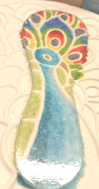What once started as an ‘oops’ project is now being trialed intentionally … a bright peacock spoon rest:
