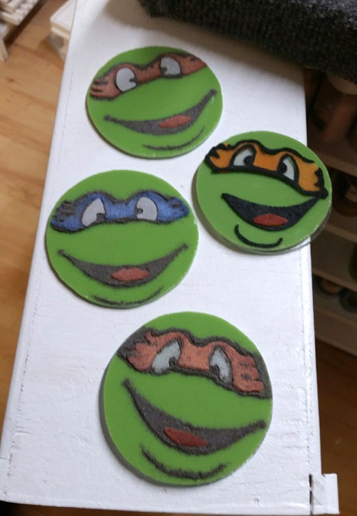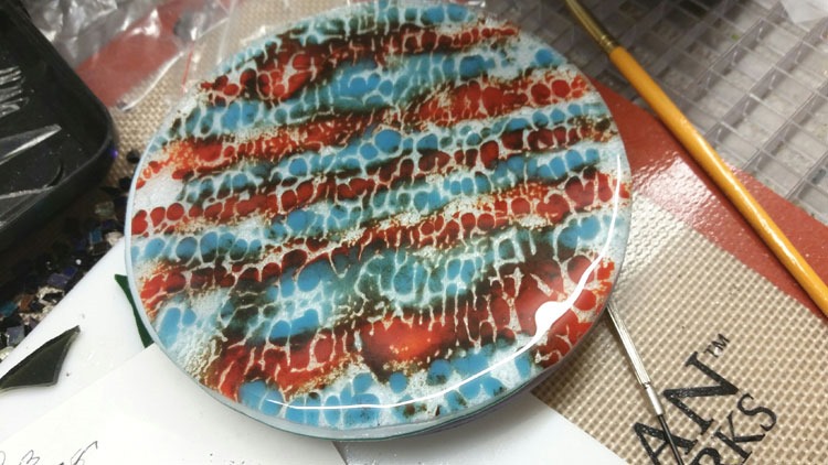 I’ve started a tapestry trial; My crackle bowl with color reactions; I made my own mylar stencils, as I was getting frustrated with powder wafers. (Had to run it through my plotter 5 times! But, I got it!!!) So now I have a few TMNT ornaments to fire …