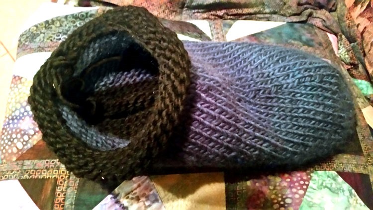 But, here’s my knitting: One of Grandpa’s (ginormous, waiting to be felted) slippers. The fact that I RAN OUT of black wool, and I’m waiting for the package to arrive so I can finish the second slipper … well, it can’t be helped – so I’m not going to stress it. And, my Dad’s scarf – okay, that picture was from yesterday, and I’ve successfully double knitted through the end pattern (so there are two storm troopers in between some 3+ feet of scarf now) … I’m 15 rows and fringe-on-both-ends away from being done!