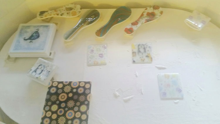 I have two kilns running now, as my coffin load waits for a few more items before starting it’s slumping firing … Here’s my poppy plate with reverse painted edges … Hmmm. And, I decided to try another stamp painting – this one on papyros. I hope to fire it tomorrow, maybe … we’ll see.