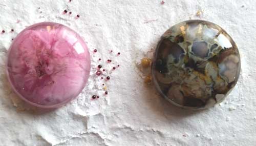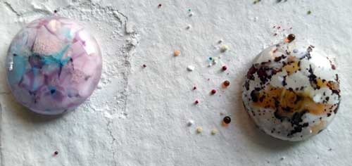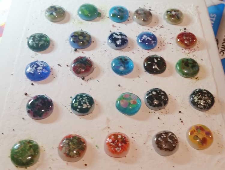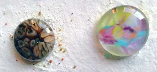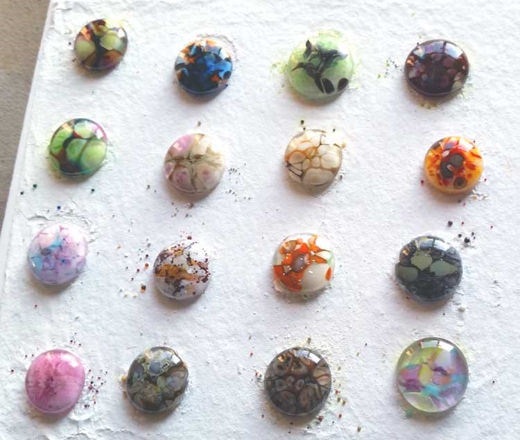 Moving on … I’m in a cab craze. The mica cabs didn’t work out, and in retrospect, at the high temps I take the cabs through … they wouldn’t. [Duh!] But, the enamel with crushed glass, hot glass and frit … There’s definitely some playing to do there! So – here are the photos: Cabs from my last post, close-ups; Cabs pre-fire and post, back in the kiln for another round right now; Today’s cabs waiting for their turn in the kiln: